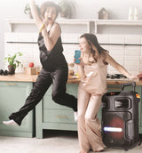 This 12" Woofer Karaoke Bluetooth speaker comes with a mic. It is perfect for indoor & outdoor use. Microphone included to let you have fun singing karaoke with your family or friends. This model also has built in FM Radio to tune in your favorite radio station. LED dancing lights around the woofer with different light modes. Equipped with TWS function so you pair two of these speakers.
