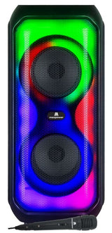 The MPD426-AURA is a powerful Bluetooth karaoke speaker with 4" x 2 woofers, delivering loud and clear sound. Comes along with a mic for karaoke, you can have fun with family and friends. Its handle makes it easy to carry and the fast type c charging input ensures quick charging. Enjoy different LED light modes or turn off the lights for a more subdued atmosphere.